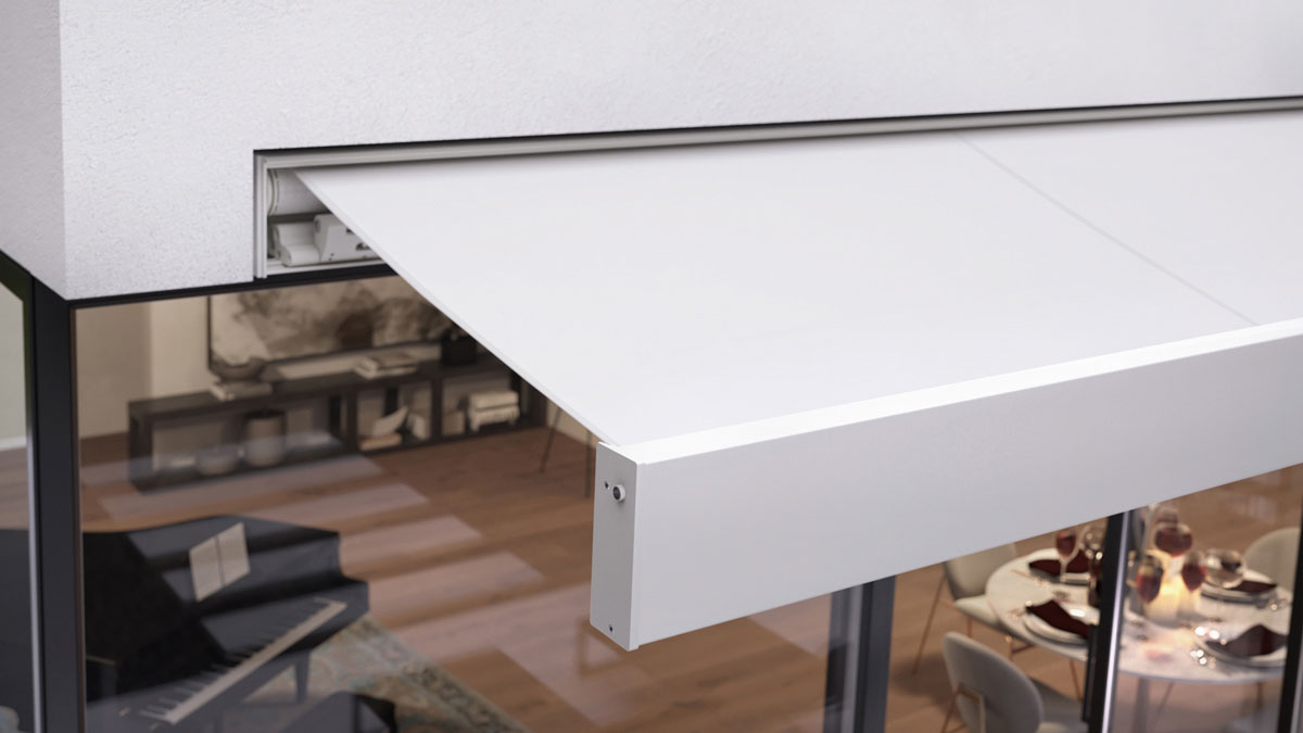 Diese praktische eckige Markise eignet sich perfekt für den Einbau unter Vorbauten oder in Nischen - je nach Bausituation verschwindet das glatte Ausfallprofil vollständig in der Wand oder liegt bündig mit der Fassade.