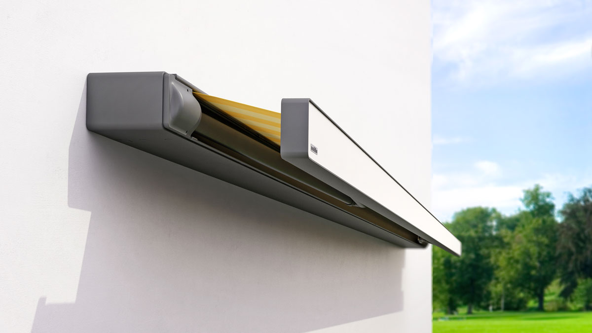 Die Optik einer Kassettenmarkise mit der Leichtigkeit der Halbkassette. Die rund geformte Schale bietet Schutz für das Markisentuch und lässt sich individuell anpassen.